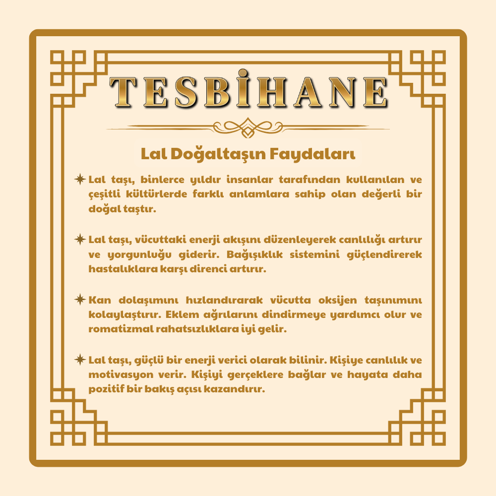 Canlı kırmızı tonlarıyla dikkat çeken lal taşı, tarih boyunca enerji ve canlılık taşı olarak benimsenmiştir. Vücuttaki enerji akışını dengelediğine ve yorgunluğu azalttığına inanılır. Bağışıklık sistemini destekleyerek hastalıklara karşı direnci artırabilir. Kan dolaşımını hızlandırarak oksijenin daha etkili taşınmasına yardımcı olur. Romatizmal rahatsızlıklara ve eklem ağrılarına karşı rahatlatıcı etkiler sağlayabileceği düşünülür. Aynı zamanda kişiye motivasyon ve yaşam enerjisi kazandırması, duygusal dengeyi desteklemesiyle öne çıkar. Günlük hayatta pozitif bir bakış açısı arayanlar tarafından tercih edilir.