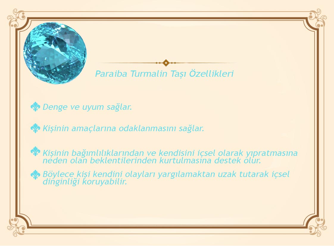 Paraiba taşı, denge ve uyum ve kişinin amaçlarına odaklanmasını sağlar. Kişinin bağımlılıklarından ve kendisini içsel olarak yıpratmasına neden olan beklentilerinden kurtulmasına destek olur. Böylece kişi kendini olayları yargılamaktan uzak tutarak içsel dinginliği koruyabilir.